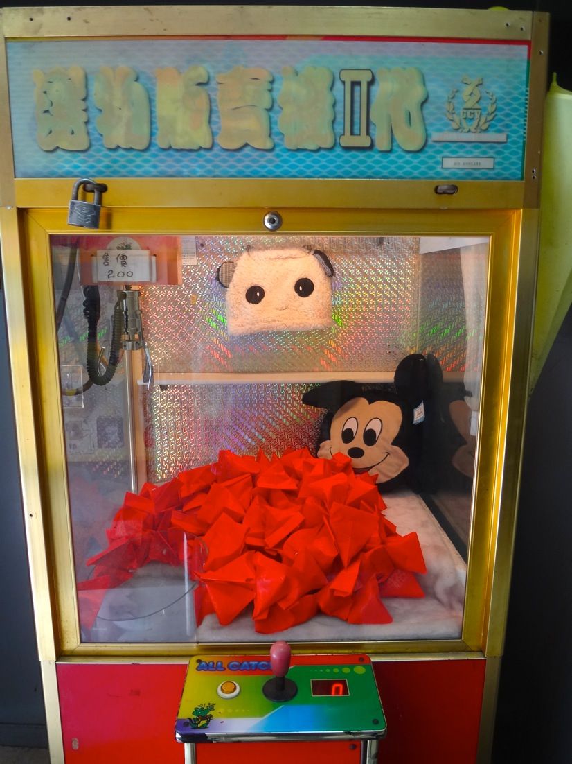 1階はゲームセンターになってて、やたらレトロな「なんじゃこりゃ〜?」みたいなゲームと最新ハイテクゲームが渾然一体としてて面白かった。しかしこのUFOキャッチャーはすごい気になったなあ(笑)。赤い紙袋の中はなんだったんだろう?