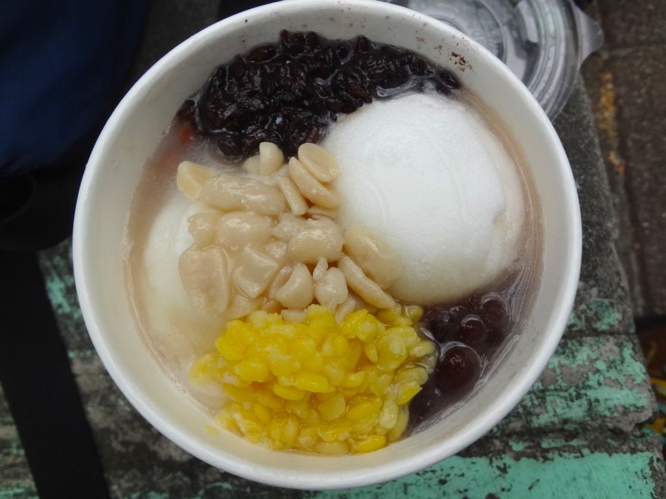 アイスにいろんな豆が乗ってて、タピオカ入りの蜜をかけて食べる。アイスの下はまさかの豆腐!しかも量がどんぶり一杯くらいある(笑)。