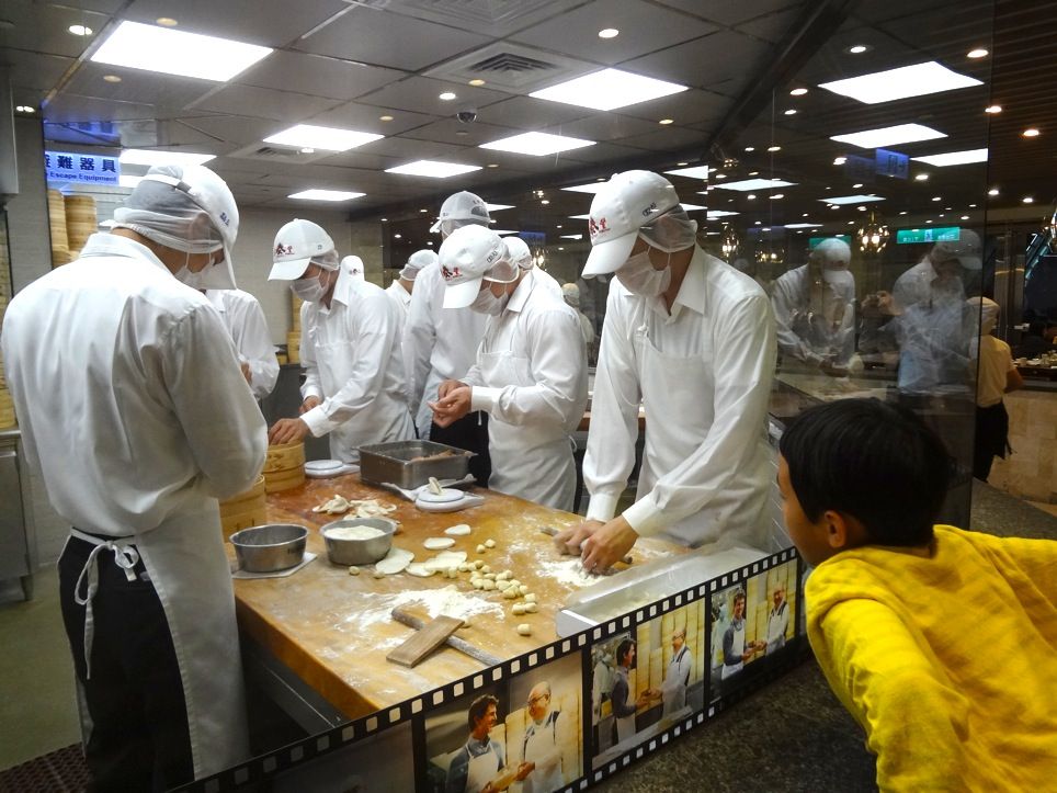 しかし、200人は余裕で入るようなでっかい店内なのに、人気店過ぎて60分待ち。ガラスの向こうには小龍包を作る大勢の職人さんたち。