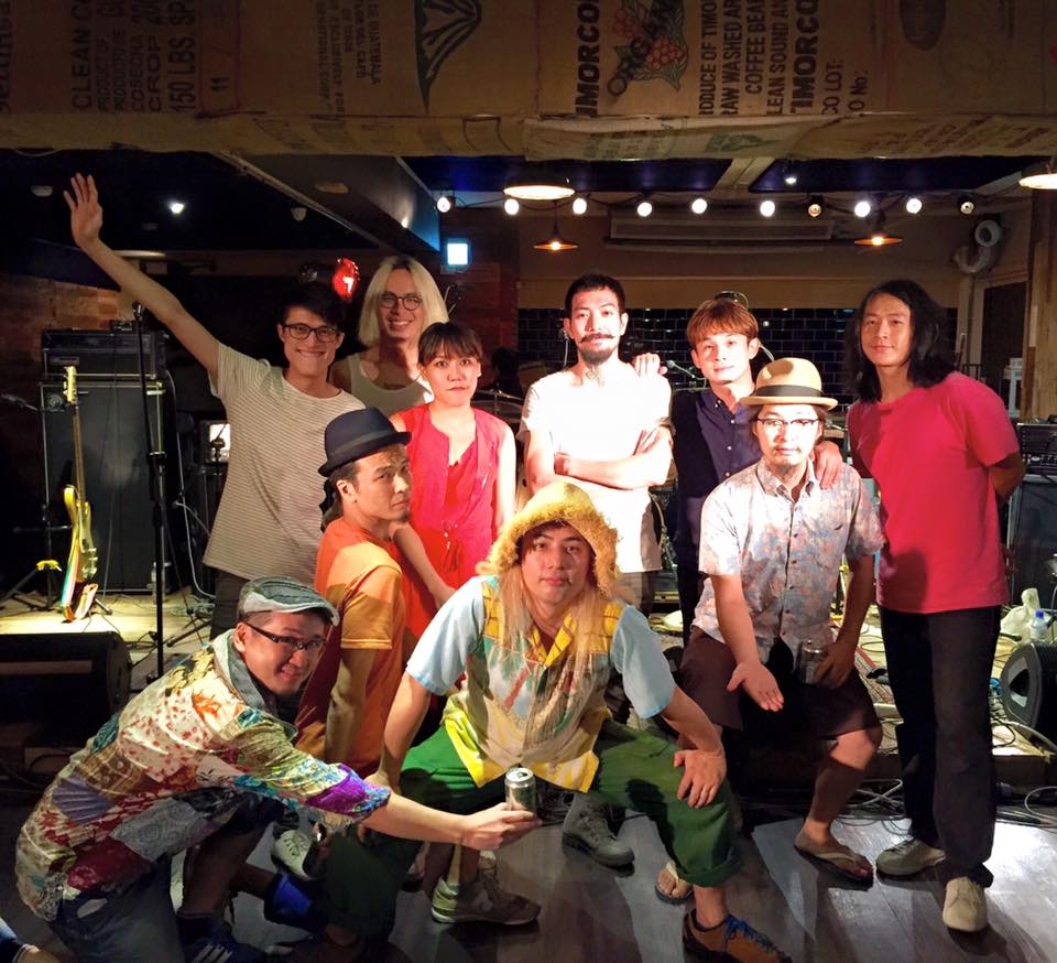 そんなわけで、台湾ノントロッポのデビューライブ。前日に数時間リハしただけで本番に挑んだけど、メンバーの奮闘により熱いライブに!お客さんも徐々に踊りだし、最後はかなりフリーダムな盛り上がり!おかげでボギーは台湾でも「いつもと何も変わらない」ライブがやれた(笑)。 写真は終演後に対バンのみんなと。