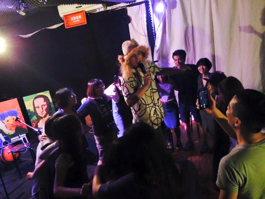 台湾でボギーは無名。弾き語りはもちろん日本語なので歌詞の意味は通じない。ボギーの歌は歌詞に比重があるので、果たしてどこまで伝わるだろうと思いながら、MCはほとんど意味をなさないくらいカタコトの英語を勢いでまくしたて、いつも通り芋焼酎呑みながら「うんこ」や「カーニバル」を歌い。「ERIMO岬」でダンス踊った。