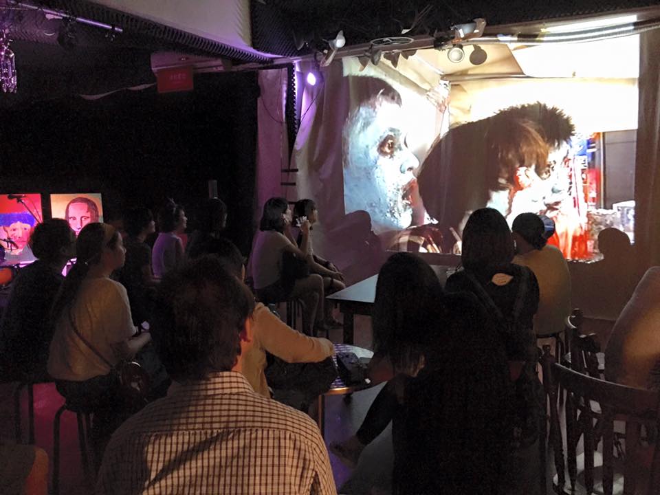 まずは映画上映、15年前に作ったボギー監督作品「博多ゾンビ」と「7人のゾンビ」...。これはゾンビ映画好きすぎて自分で作っちゃったんだけど、ただ単にゾンビメイクして博多の街をぶらぶら散歩してるだけの超低予算C級映画である(笑)。