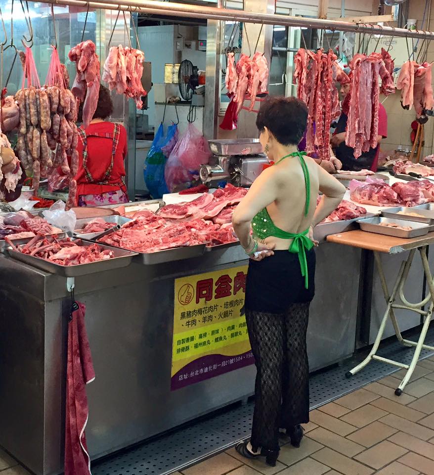 永楽市場の肉屋さんで気になりすぎるファッションのおばちゃん発見したので隠し撮り(笑)。