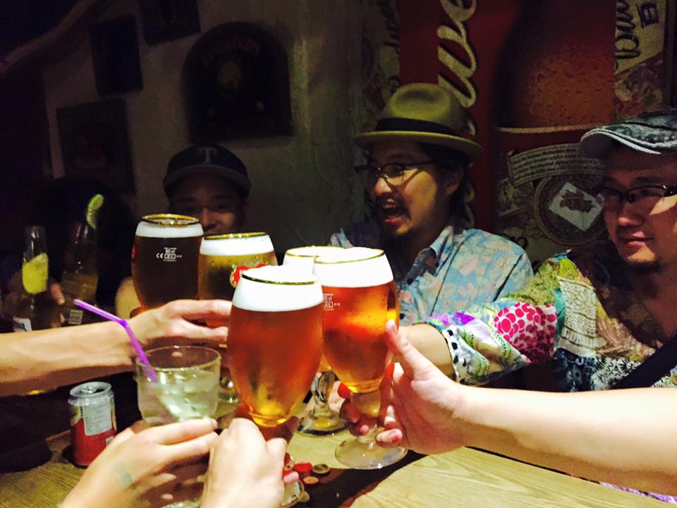 台湾初ライブの良い手応えを酒の肴に、打ち上げはバーで乾杯!あー、ビール美味いっ!