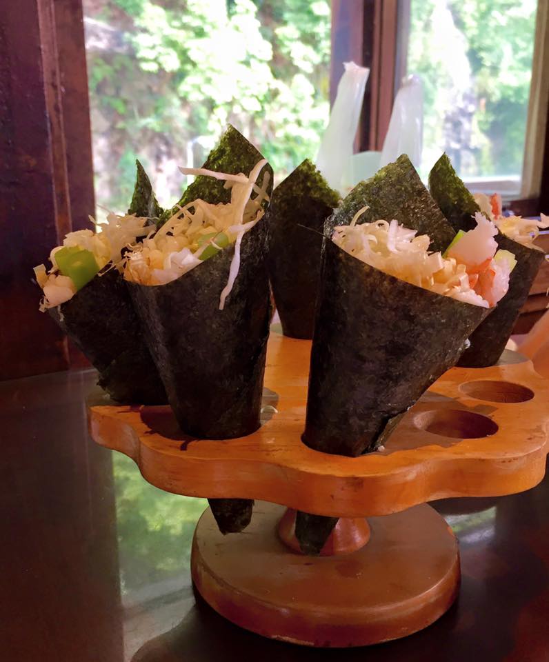 料理も焼き鳥や手巻き寿司など日本食がメインなのだが、手巻き寿司を頼んだらすごいのが出てきた。なんと海苔で巻いてあるのはシャリではなく千切りキャベツ(笑)!!!!