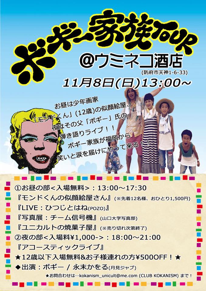 夏休みに全国を廻ったボギー家族ツアーのプチ・バージョンが決まりました!今回は、広島と山口、そして福岡は二日市です。モンドやテンちゃんの似顔絵屋さん、ボギー家族のライブをぜひぜひ。