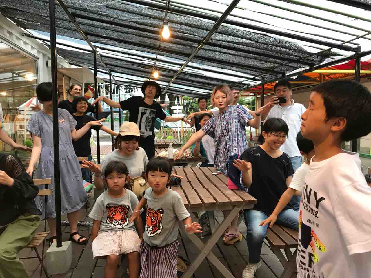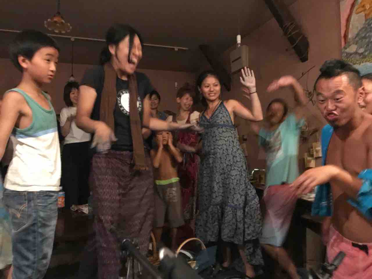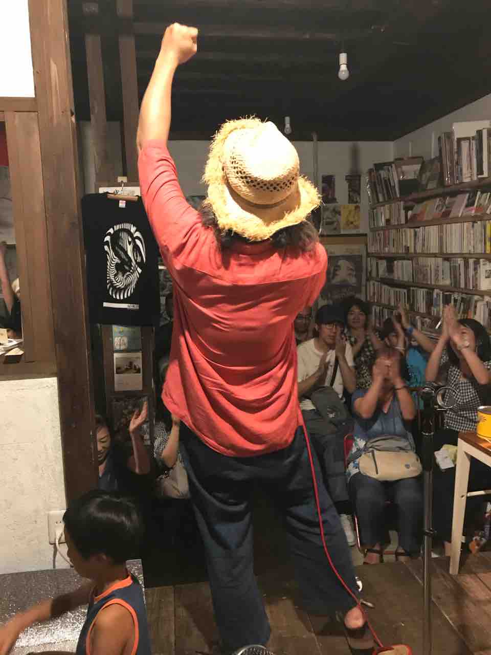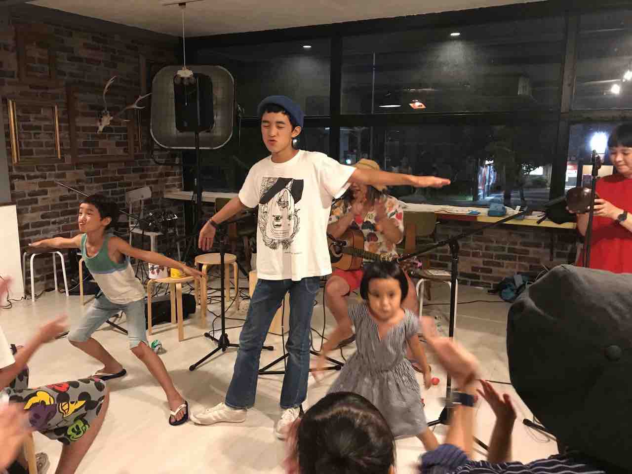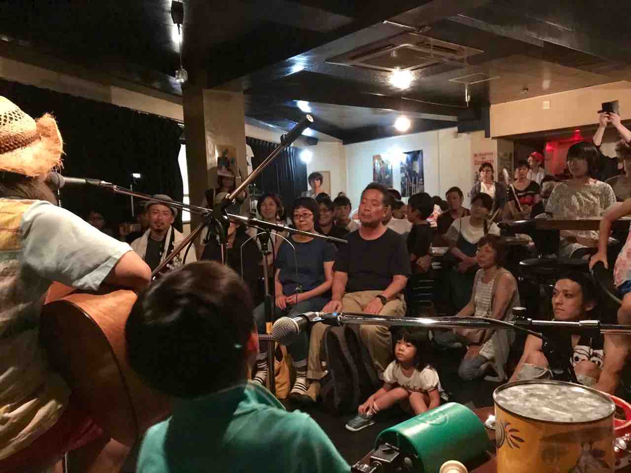 急遽なのでもちろん音響設備は無し、生声と生音のみで40分間!今ちゃんはまるでポールダンサーのように柱を登ってくるくる回る!テンちゃん叫ぶ!モンドはいつもどおり(笑)。家族一丸で盛り上げる!!