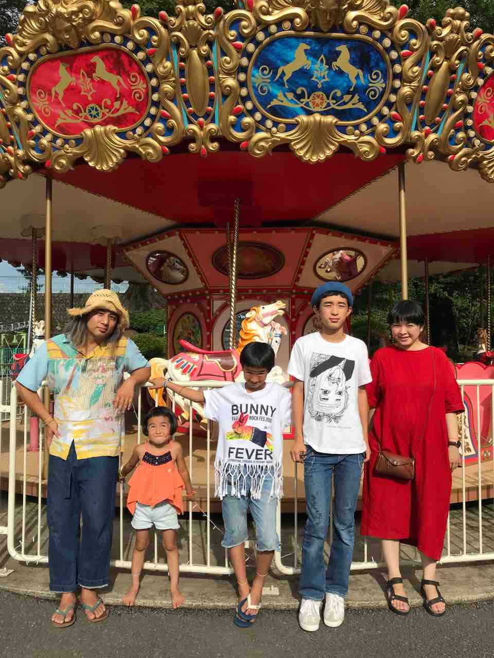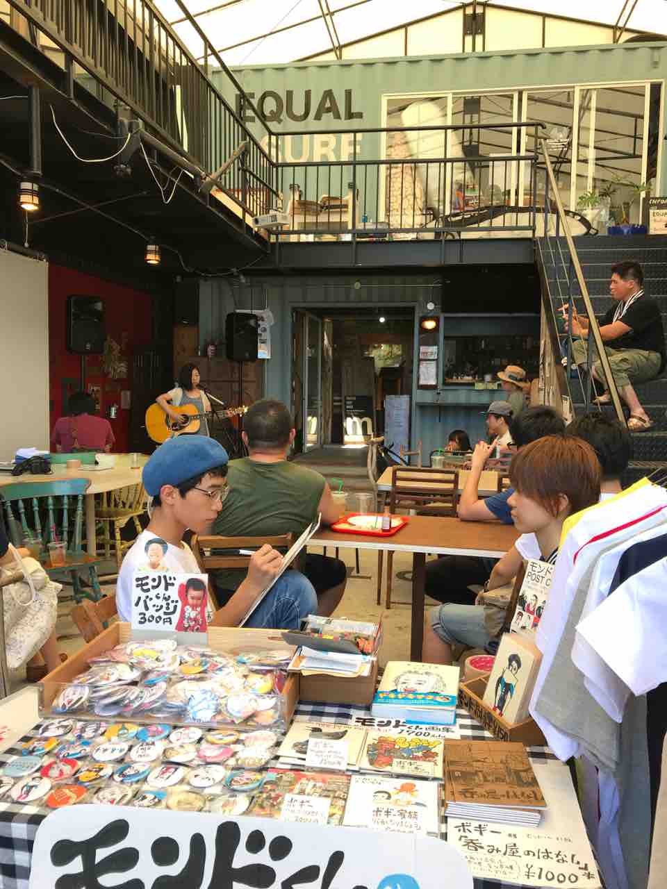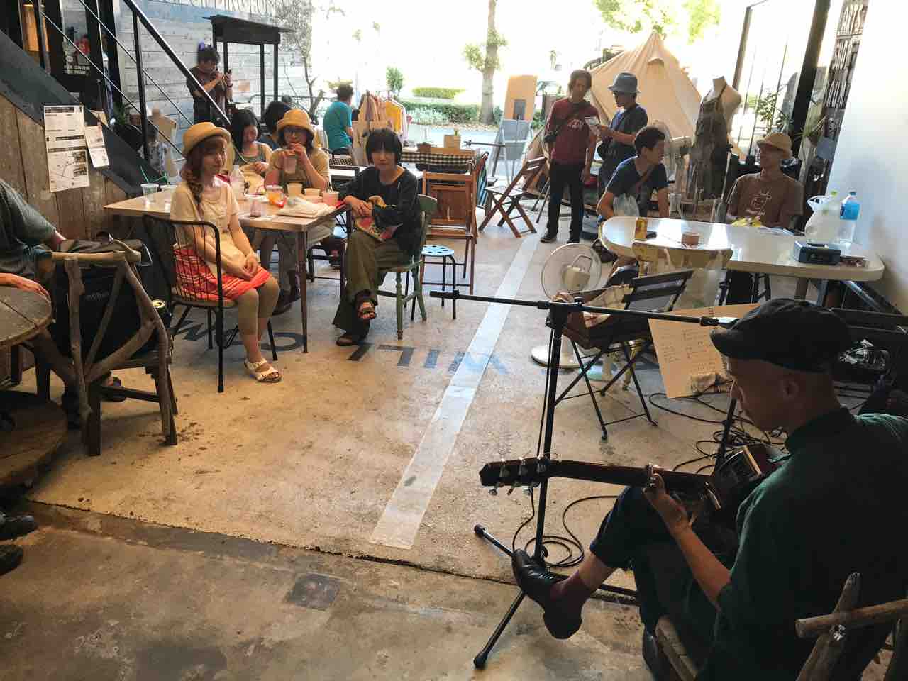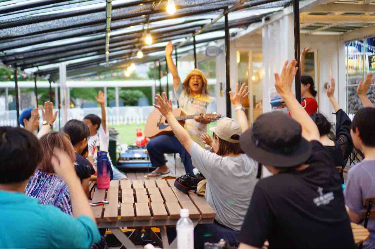 一旦は中止になった遊園地ライブだったけど、このまま帰るのはどうしてもイヤだったのでスタッフさんたちに相談し、急遽、屋根のあるスペースでボギー家族の投げ銭ライブをやることに。それをSNSで知って見に来てくれた方々もいて、20人ほどのお客さんが集まってくれた。