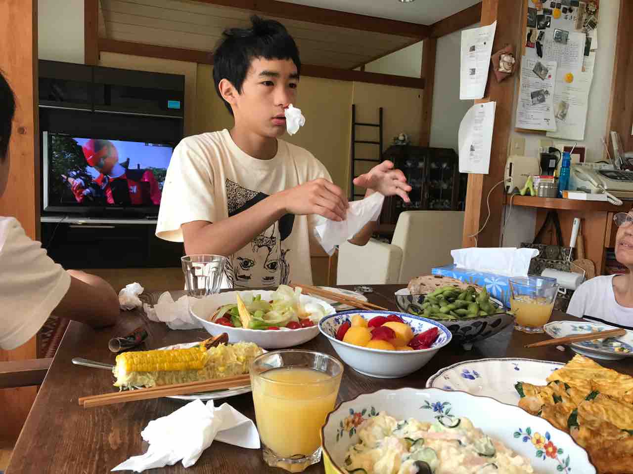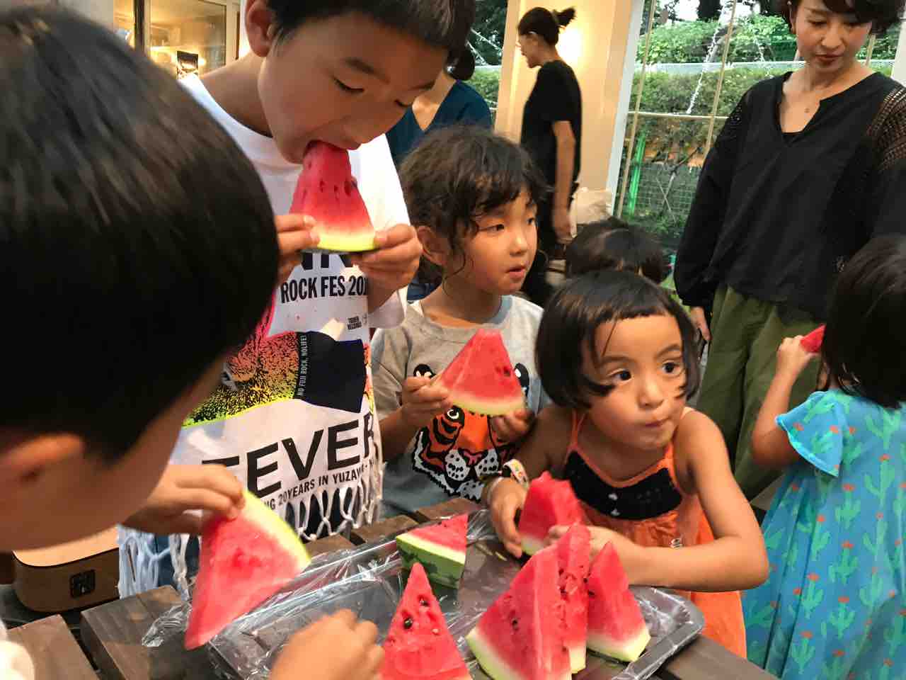 スタッフさんがスイカをたくさん切ってくれて子供たち大喜びでかぶりつく。良かったねー!忘れられないね。