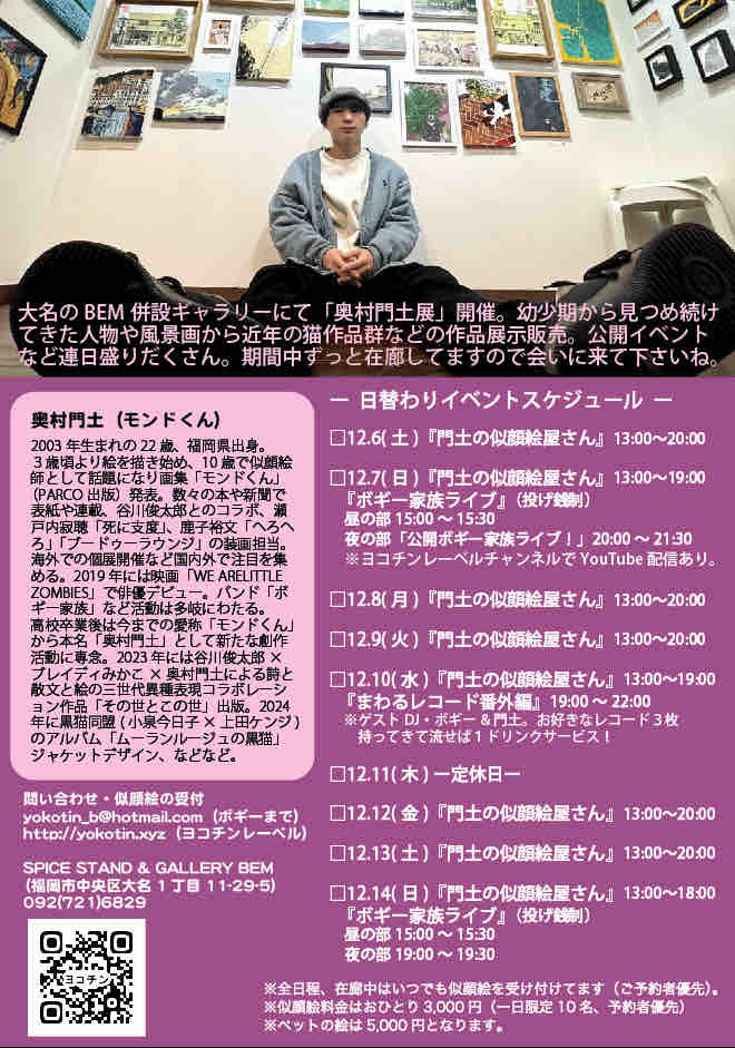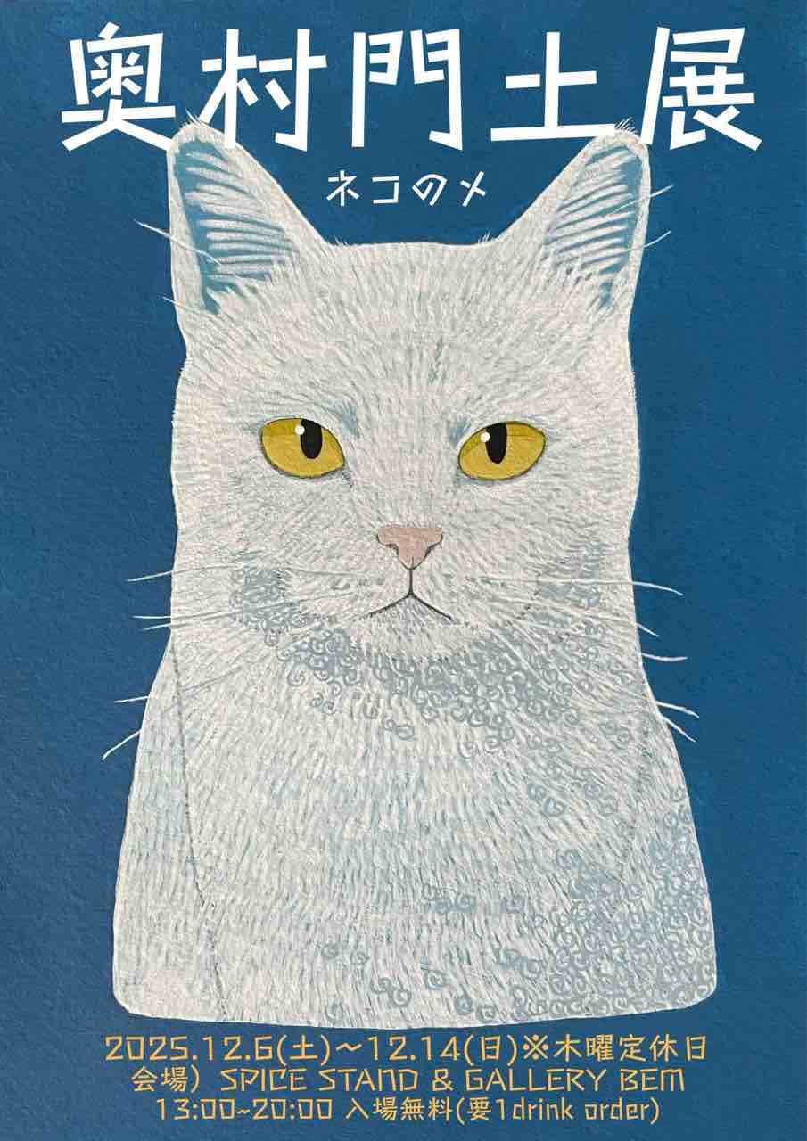 大名のBEM併設ギャラリーにて「奥村門土展」開催!幼少期から見つめ続けてきた人物や風景画から近年の猫作品群まで作品展示販売。公開イベントも連日盛りだくさん!期間中は毎日在廊してますので会いに来てくださいね。似顔絵はペットも描きます!