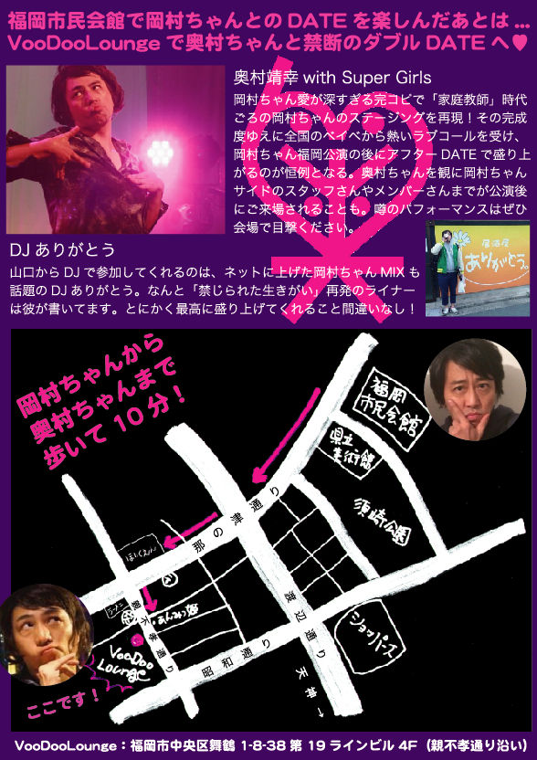※今年もご本家岡村ちゃん福岡公演のあと禁断のアフターDATEやります!会場はなんとVooDooLounge!めちゃくちゃ広いです!音響も照明もバッチリです!ベイベのみなさんお待ちしてまーす。