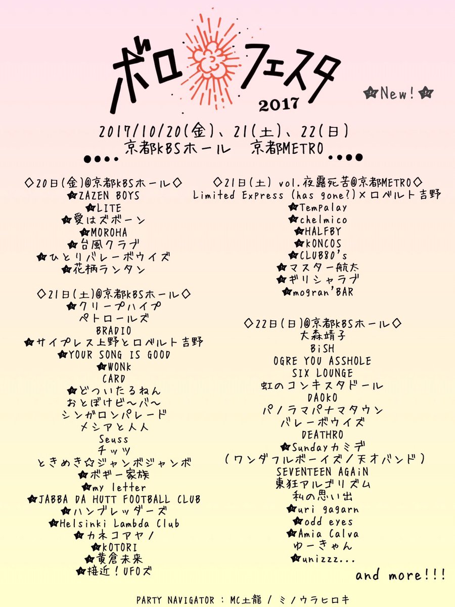 出演)大森靖子/ペトロールズ/BiSH/OGRE YOU ASSHOLE/Limited Express (has gone?)×ロベルト吉野/BRADIO/SIX LOUNGE/虹のコンキスタドール/DAOKO/メシアと人人/CARD/バレーボウイズ/パノラマパナマタウン/DEATHRO/おとぼけビ~バ~/シンガロンパレード/ときめき☆ジャンボジャンボ/SEVENTEEN AGAiN/私の思い出/東狂アルゴリズム/Seuss/チッツ/ゆーきゃん/クリープハイプ/ZAZEN BOYS/LITE/サイプレス上野とロベルト吉野/YOUR SONG IS GOOD/どついたるねん/ボギー家族/WONK/愛はズボーン/MOROHA/台風クラブ/my letter/JABBA DA HUTT FOOTBALL CLUB/ハンブレッダーズ/Helsinki Lambda Club/カネコアヤノ/ひとりバレーボウイズ/花柄ランタン/KOTORI/黄倉未来/接近!UFOズ/Sundayカミデ(ワンダフルボーイズ/天才バンド)/uri gagarn/odd eyes/Amia Calva/unizzz…/Tempalay/chelmico/HALFBY/KONCOS/CLUB80’s/マスター航太/ギリシャラブ/mogran’BAR