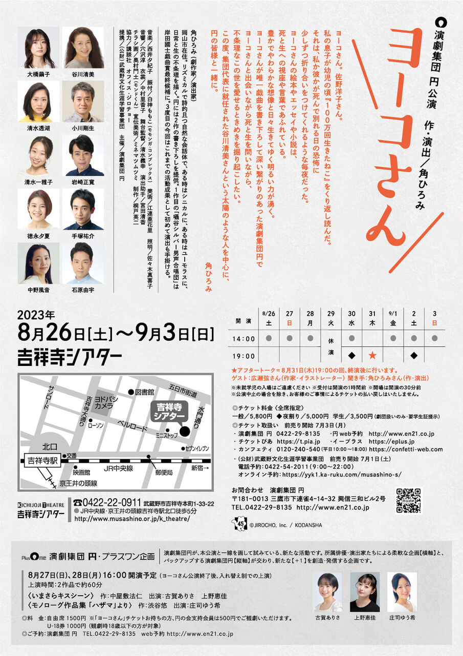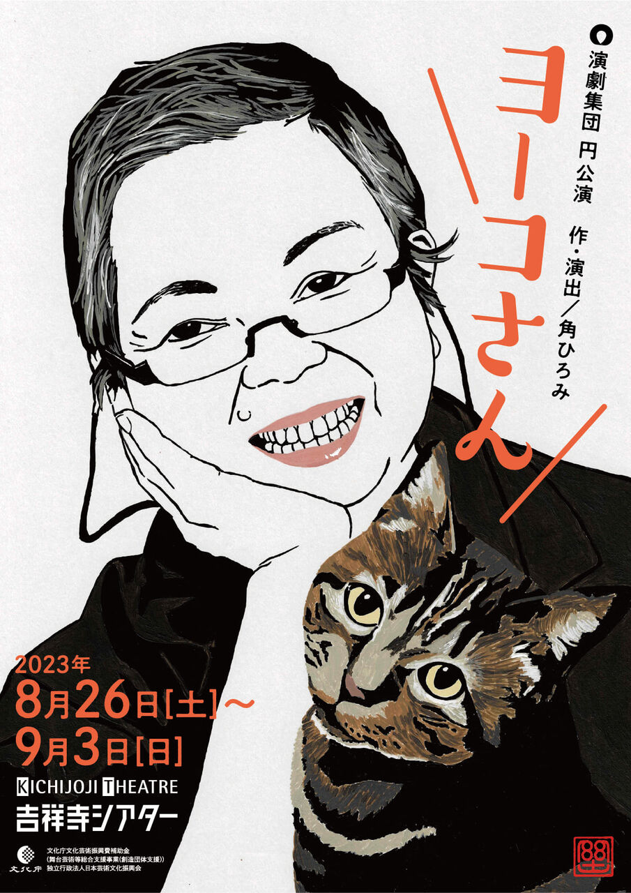 奥村門土が描き下ろした佐野洋子さんと猫の絵、演劇集団円による舞台「ヨーコさん」の本チラシが完成したようです。どうぞよろしくお願いします。